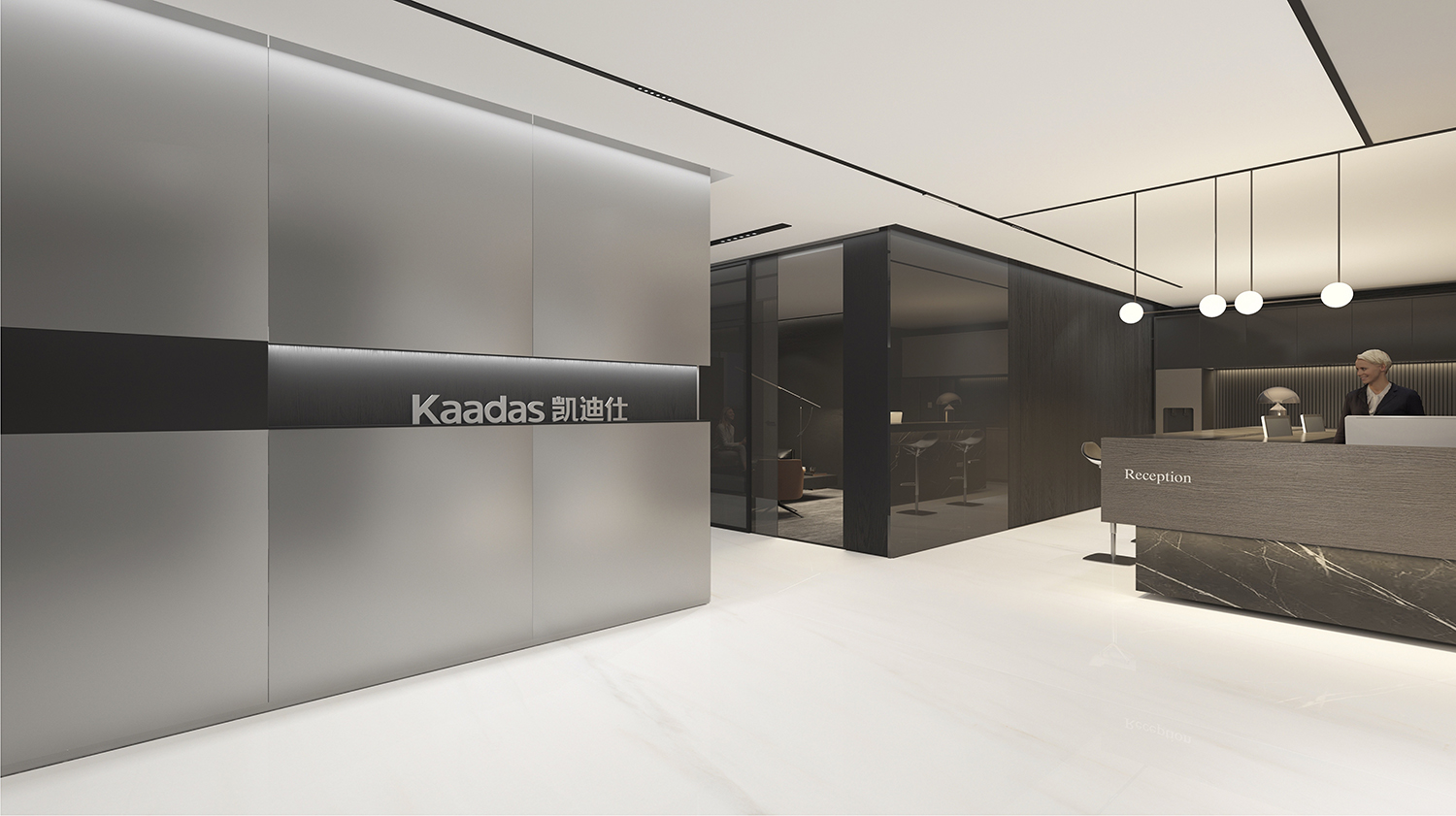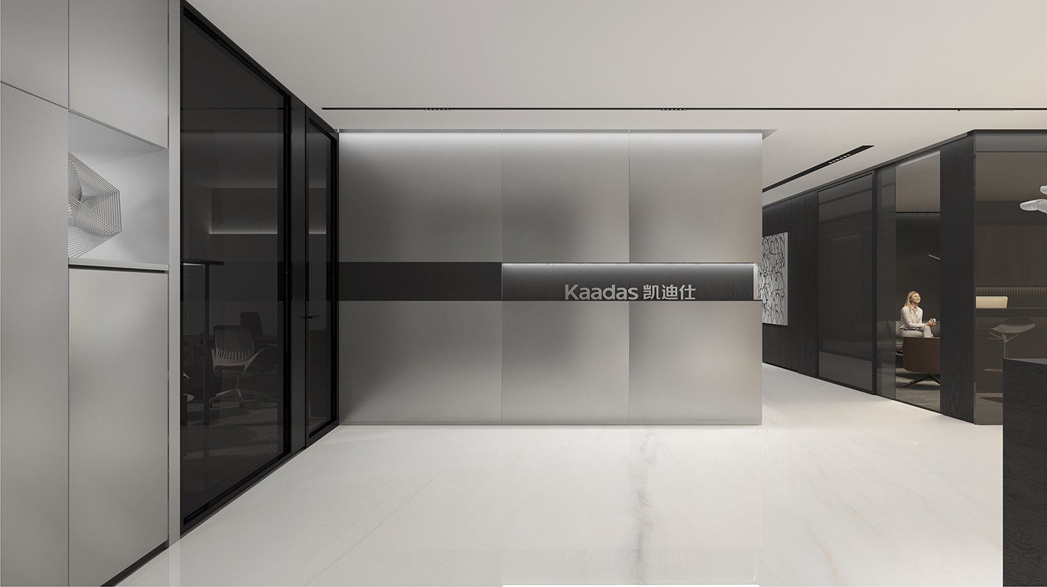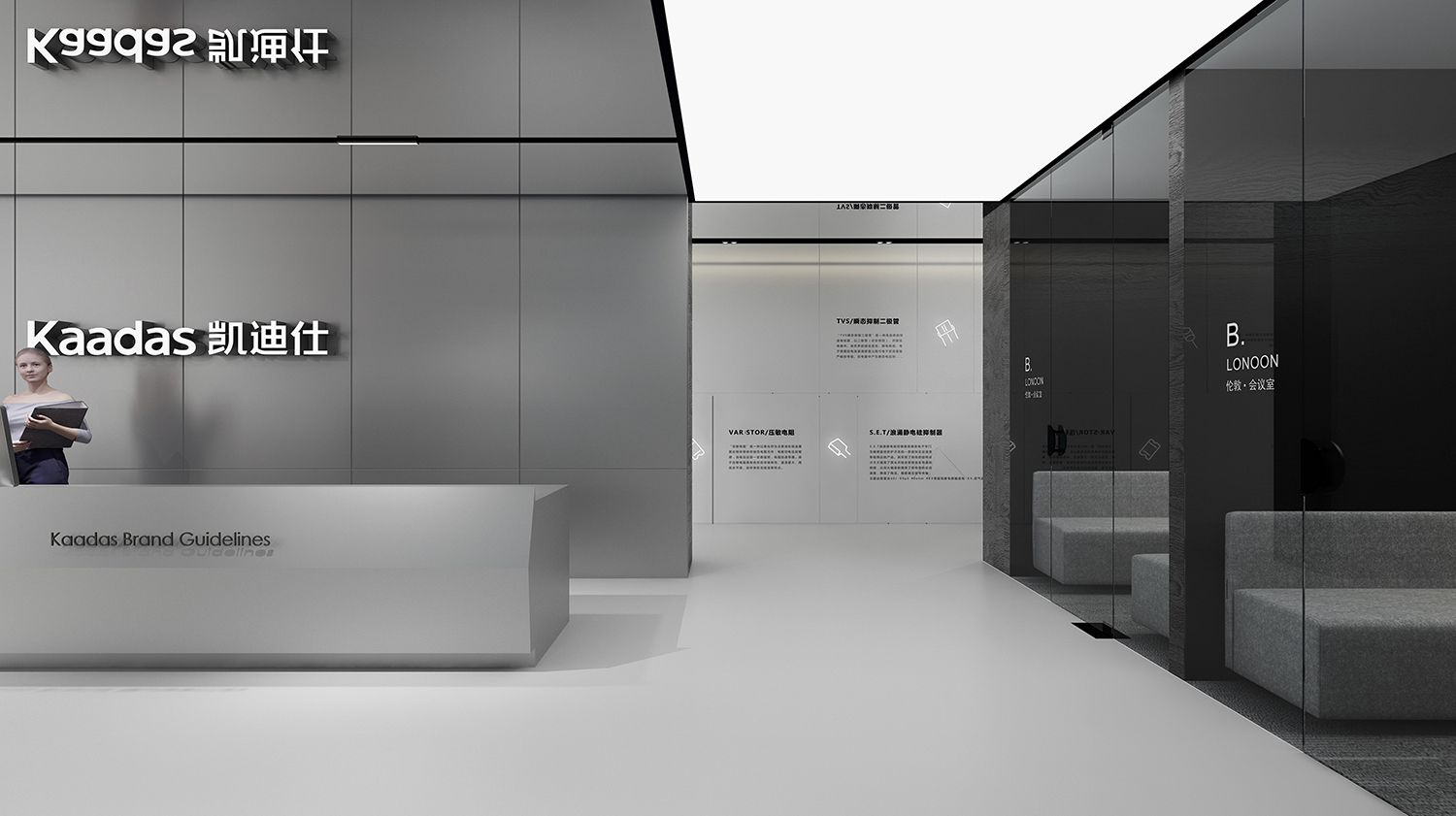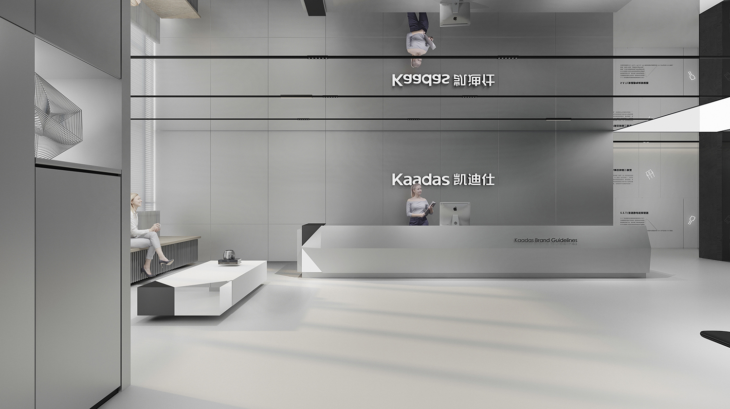 Kaadas凯迪仕作为一家专注于智能锁领域的全产业链公司,我们的设计理念旨在突显科技感、创新性,同时融入国际化的氛围。通过灰色和银色的极简色调,打造一个现代化、品质感极强的办公空间。