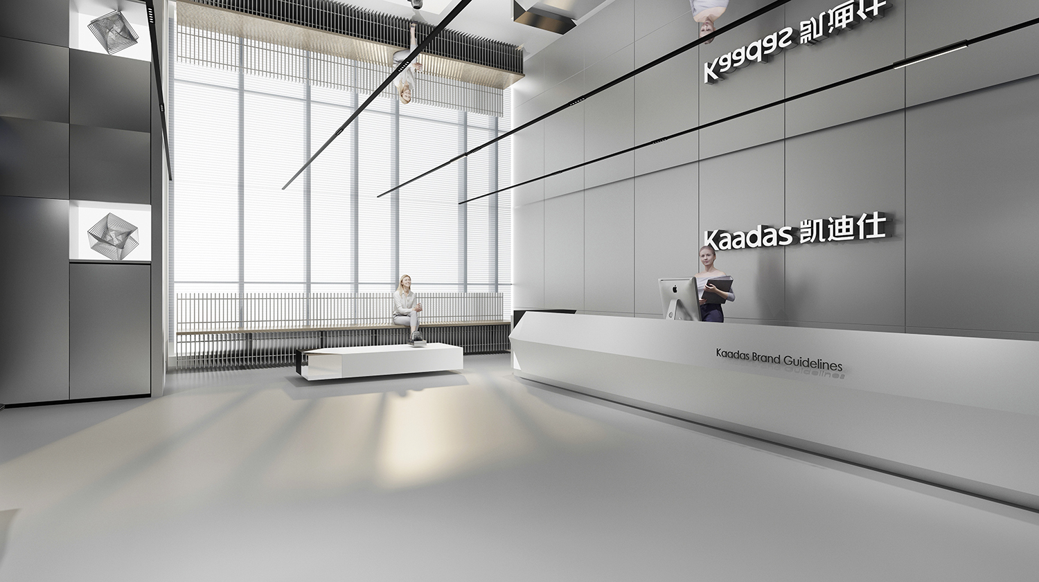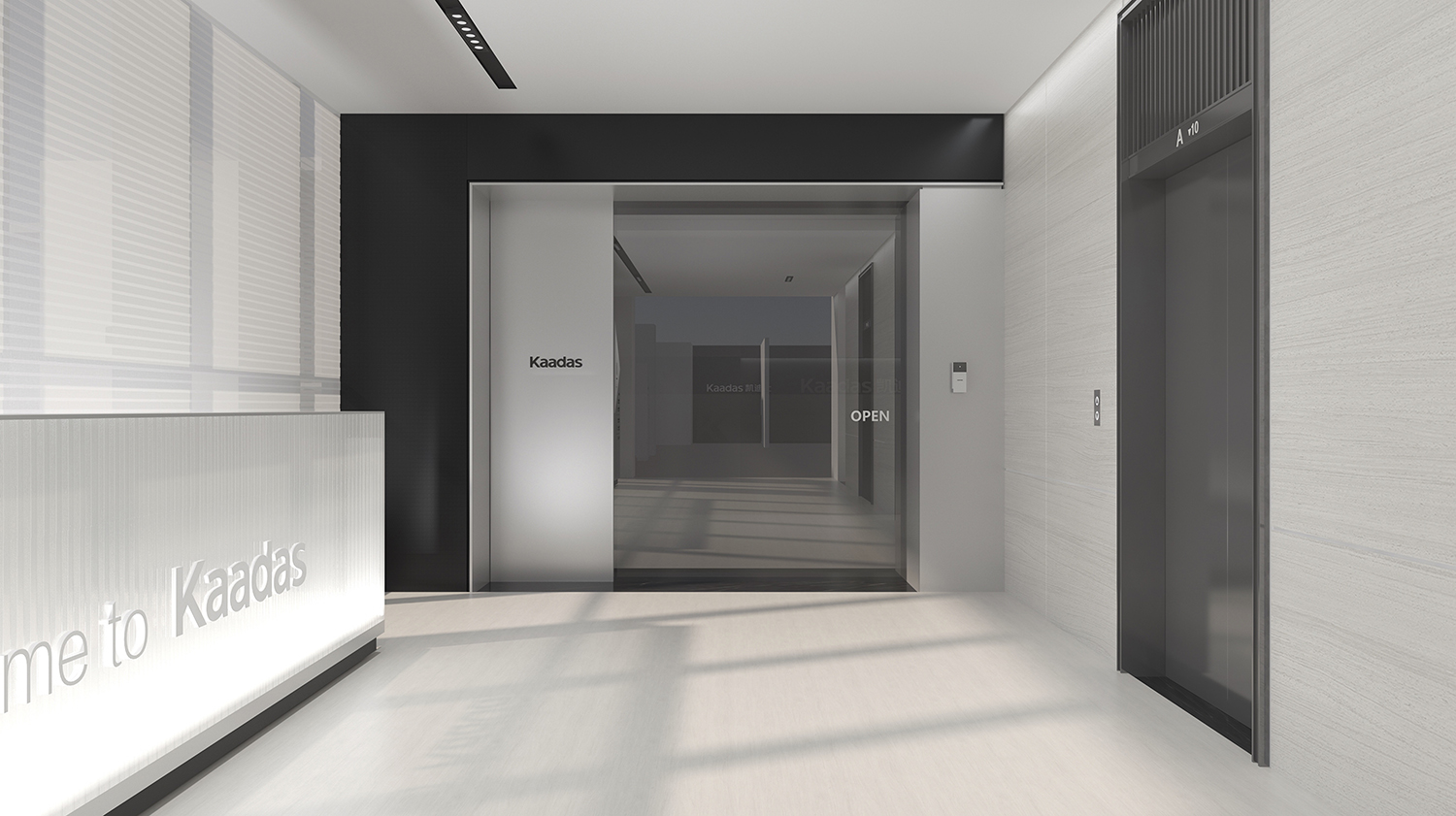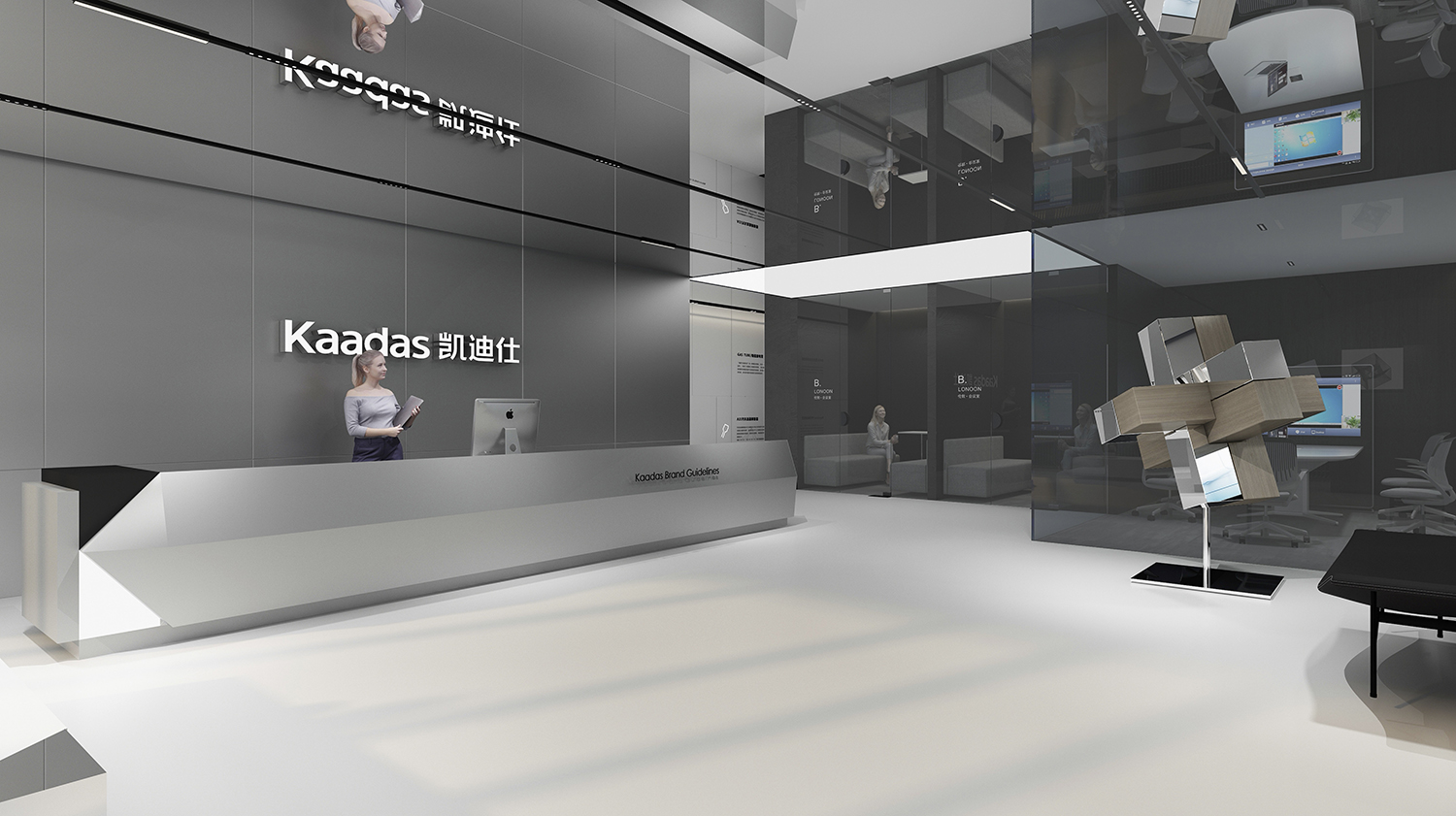 Kaadas凯迪仕作为一家专注于智能锁领域的全产业链公司,我们的设计理念旨在突显科技感、创新性,同时融入国际化的氛围。通过灰色和银色的极简色调,打造一个现代化、品质感极强的办公空间。