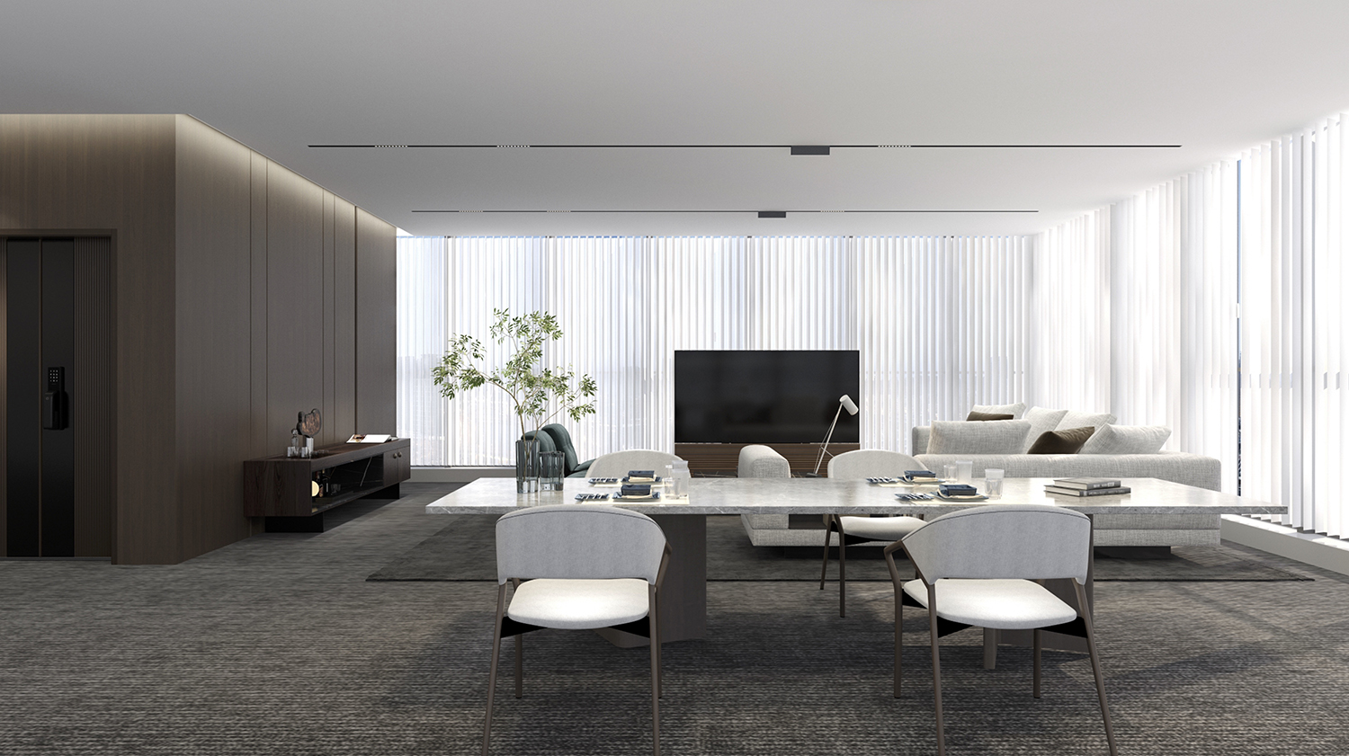 品牌色调渗透: 灰色和银色是公司品牌的主要色调,确保这些色调在整个空间中得到合理的渗透,不仅在墙壁和地板的选择上,还可以在家具、装饰品等方面呈现。