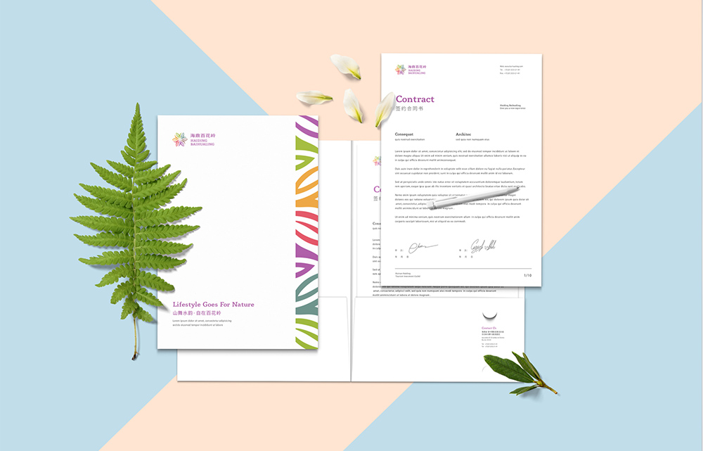 项目由海南海鼎集团投资,委托心铭舍品牌设计公司打造的景区VI设计,海鼎百花岭标志创意由书法体“百”字形成的树叶作为元素,通过组合形成花卉的造型。心铭舍以景区的定位与在地文化作为立意点,并提炼了百花岭景观元素相融合打造景区VI形象,获得了客户一致认可。