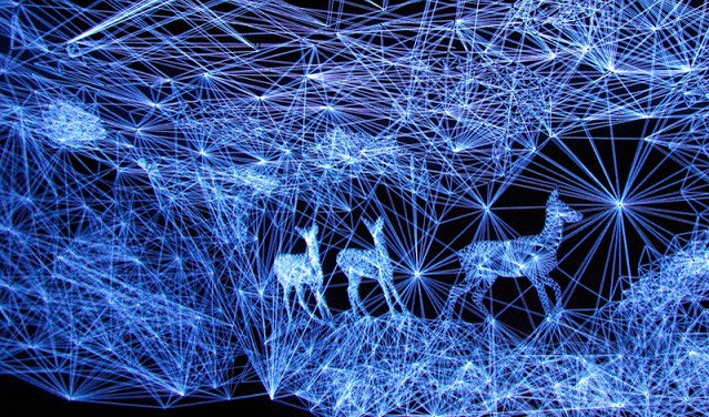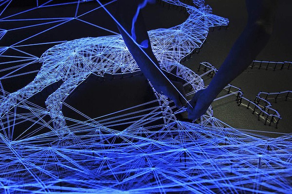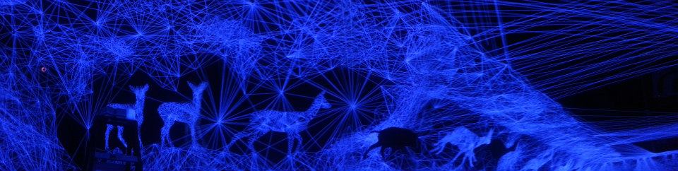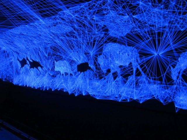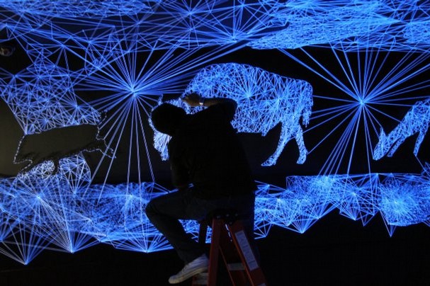 Artists install an installation art piece seen under Ultra-violet lighting titled "Stellar Cave II"