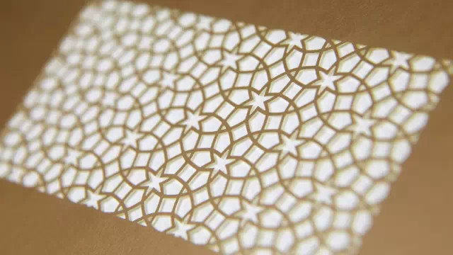 我希望请柬是既美观也兼具功能性与收藏性的,在册子的后页是通过激光镂刻雕刻处理的收纳页,雕刻出了镂空花纹,当抽出内部的纸张时才发现,原来这才是请柬本身。
