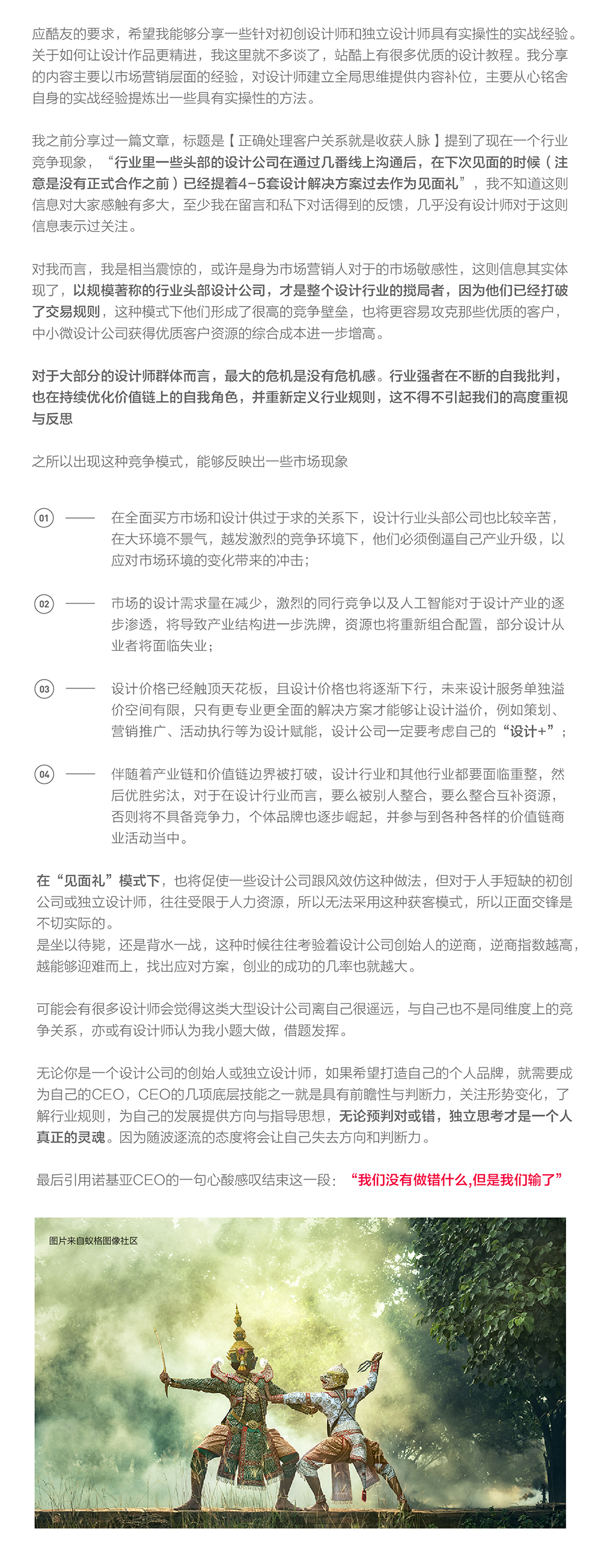 对于大部分的设计师群体而言,最大的危机是没有危机感。行业强者在不断的自我批判,也在持续优化价值链上的自我角色,并重新定义行业规则,这不得不引起我们的高度重视与反思之所以出现这种竞争模式,能够反映出一些市场现象。