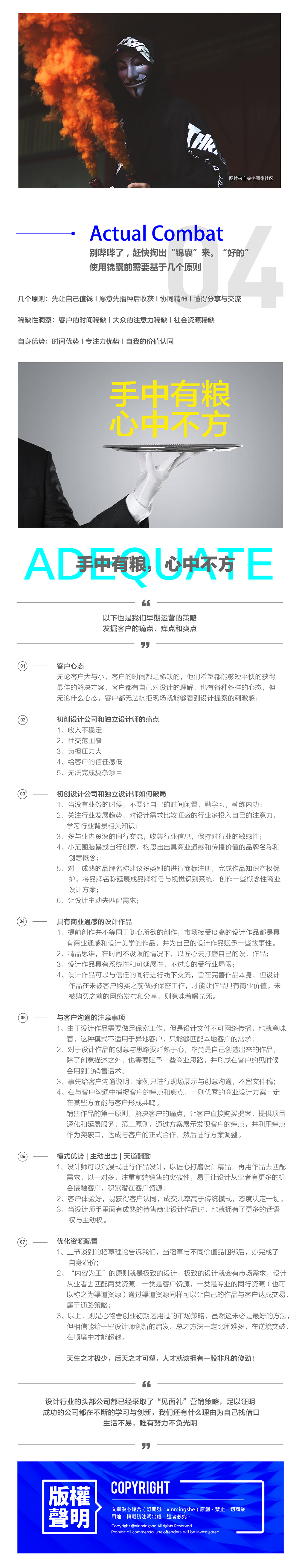 应酷友的要求,希望我能够分享一些针对初创设计师和独立设计师具有实操性的实战经验。关于如何让设计作品更精进,我这里就不多谈了,站酷上有很多优质的设计教程。我分享的内容主要以市场营销层面的经验,对设计师建立全局思维提供内容补位,主要从心铭舍自身的实战经验提炼出一些具有实操性的方法。