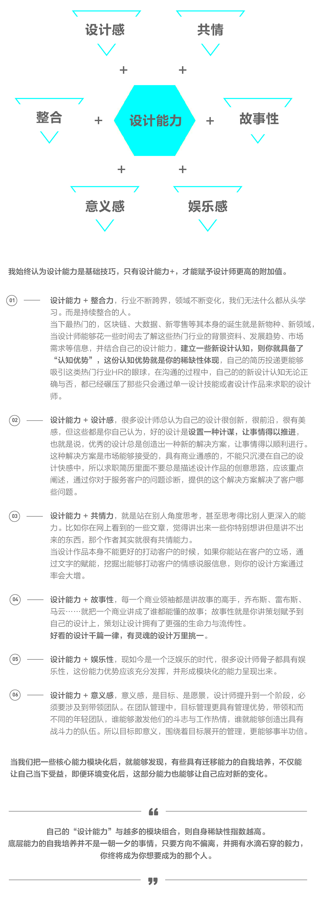 反而,设计师对行业的洞见、审美能力、商业通感力、创新等能力,才是设计师的护城河。但这些能力也只是与“工作相关的技术知识”,未来的对人才的需要将是具备 2-3种能力以上的复合型人才。