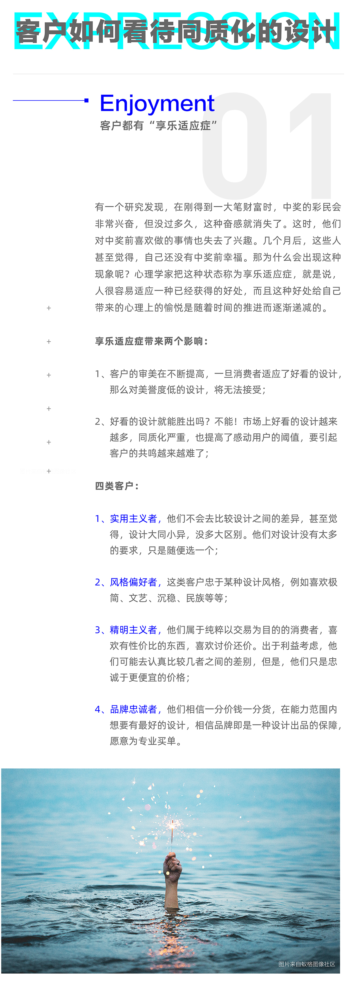 客户有错吗,当然没有错。从一方面来看设计的同质化已经非常严重,市场上80%的设计都很同质化(原因后面展开说),客户在选择设计服务商的时候,并没有什么忠诚度,也存在很大的痛点,客户在互联网上很难真实而全面的了解服务商,也就造成沟通成本增加,仅通过作品想要打动客户会越来越难;当客户最终还是选择了你,并不一定是设计俘获了客户,客户看重的还有你的其他附加值,例如行业经验、专业精神、服务态度、成功案例等,这一切的总和形成了有效的信任状。