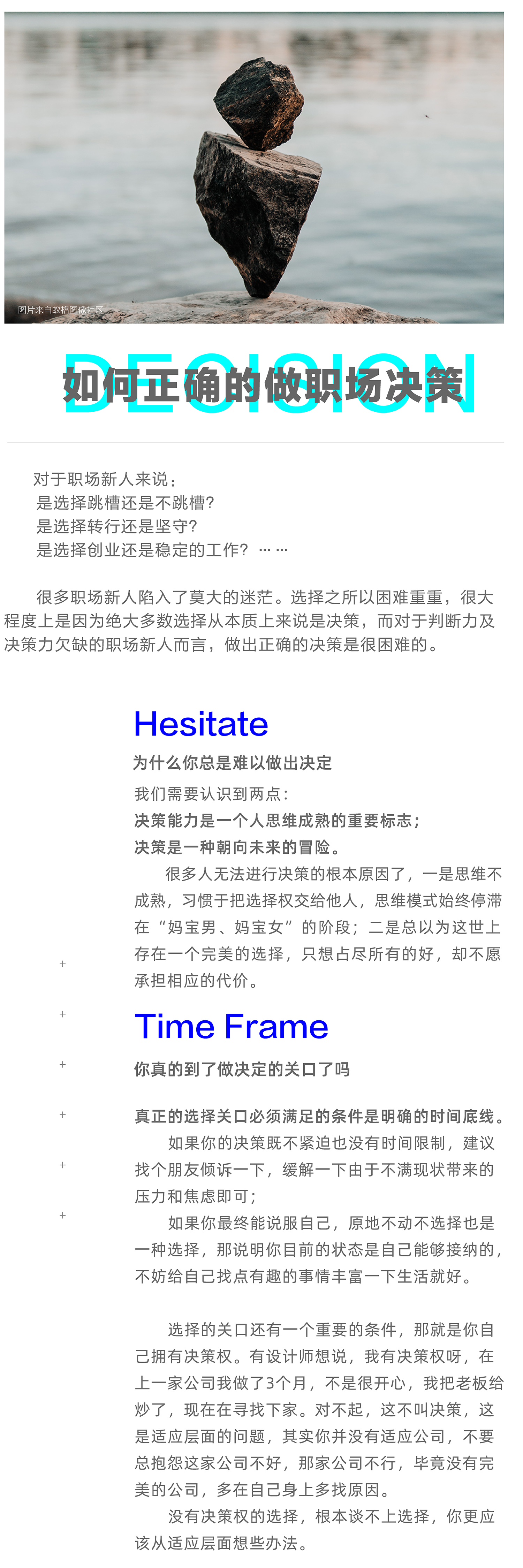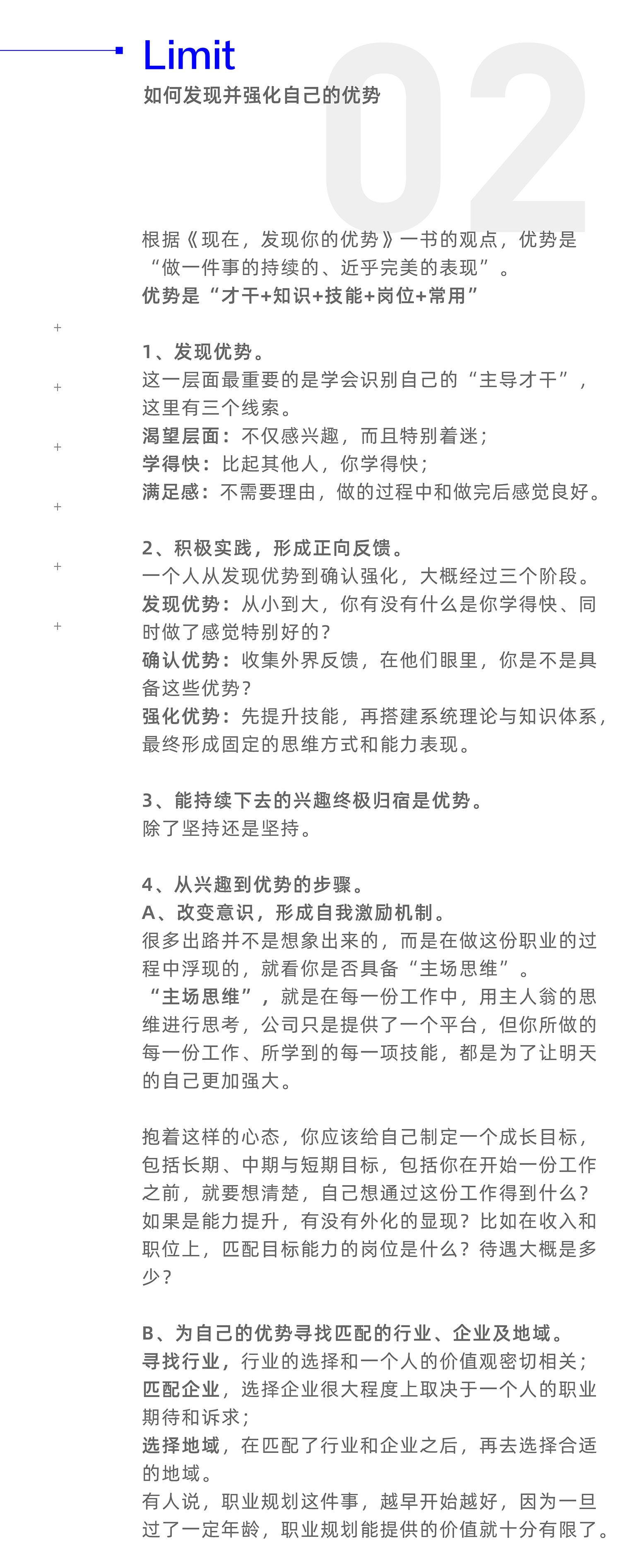 给自己定制一份职业规划并不难,有很多朋友曾经也给自己梳理过职业规划,但在现实中有一部分朋友依然在第一点上徘徊不前,始终找不到适合自己的职业起步;另外一部分人栽在第二点上,毕业几年频繁换工作,做任何职业都像是“蜻蜓点水”,很难深入某个行业获得不同的洞见;另外一部分人完成了第一项和第二项任务,但他们中的大多数却困于第三点,那就是工作多年,依然不知道自己的独特性在哪里,对于如何提升自己的市场价值更是一无所知。