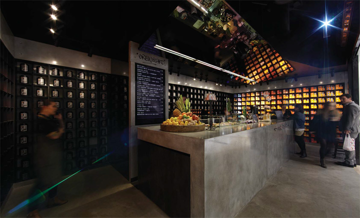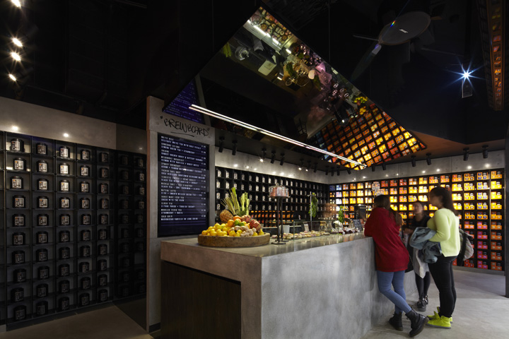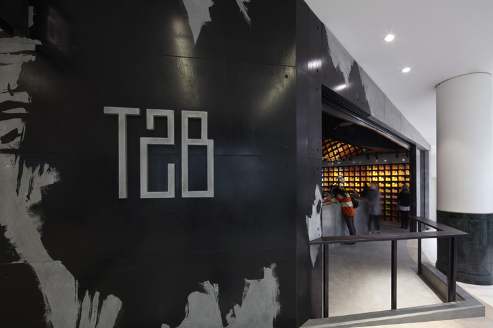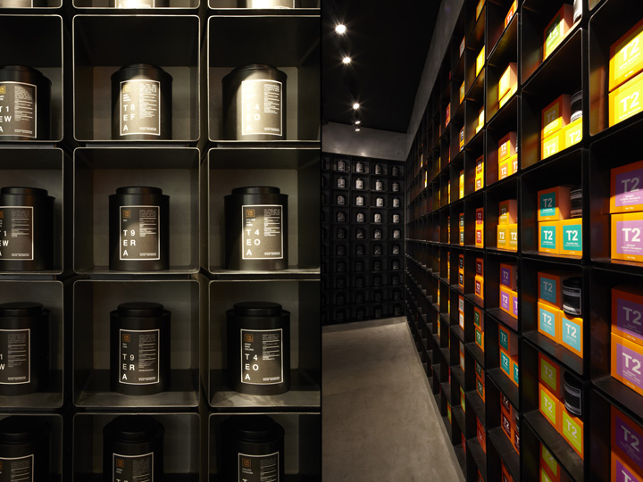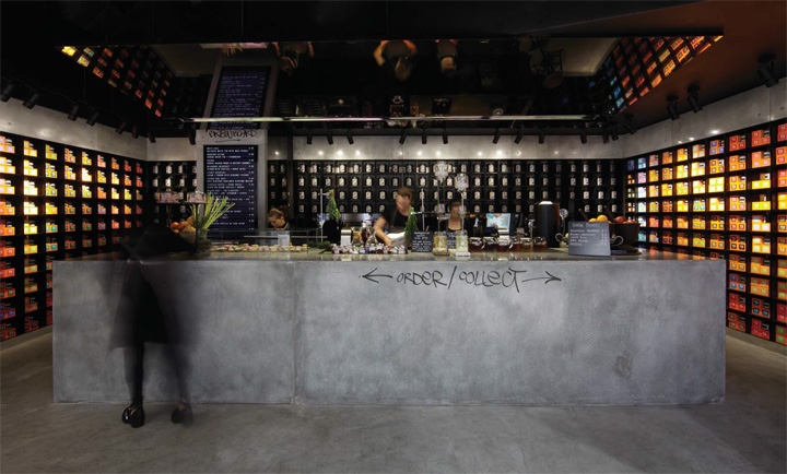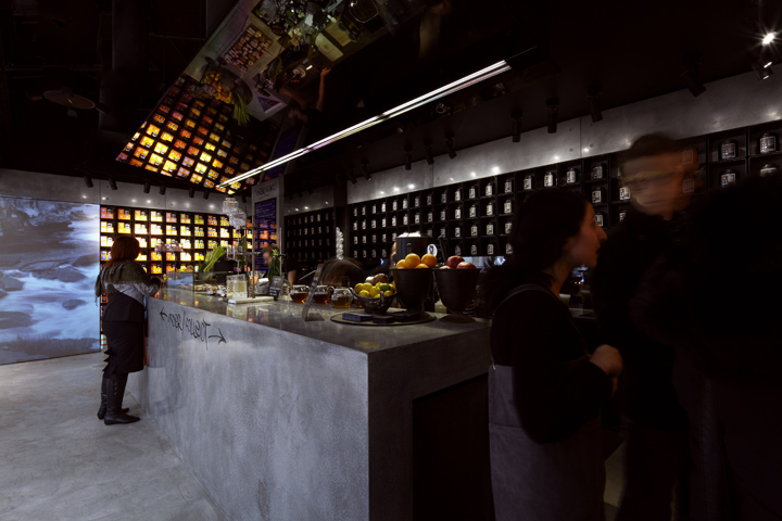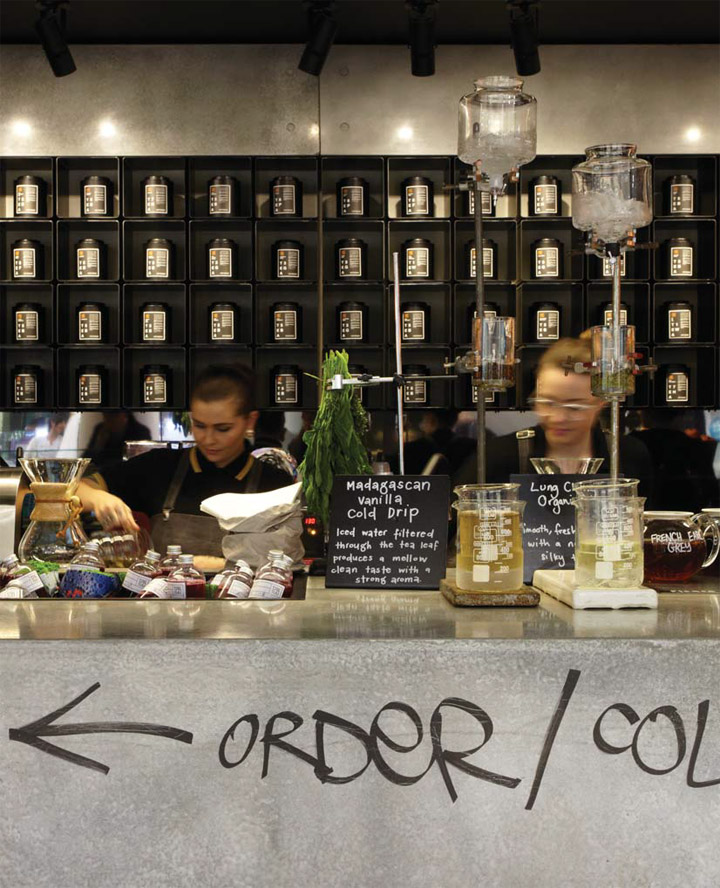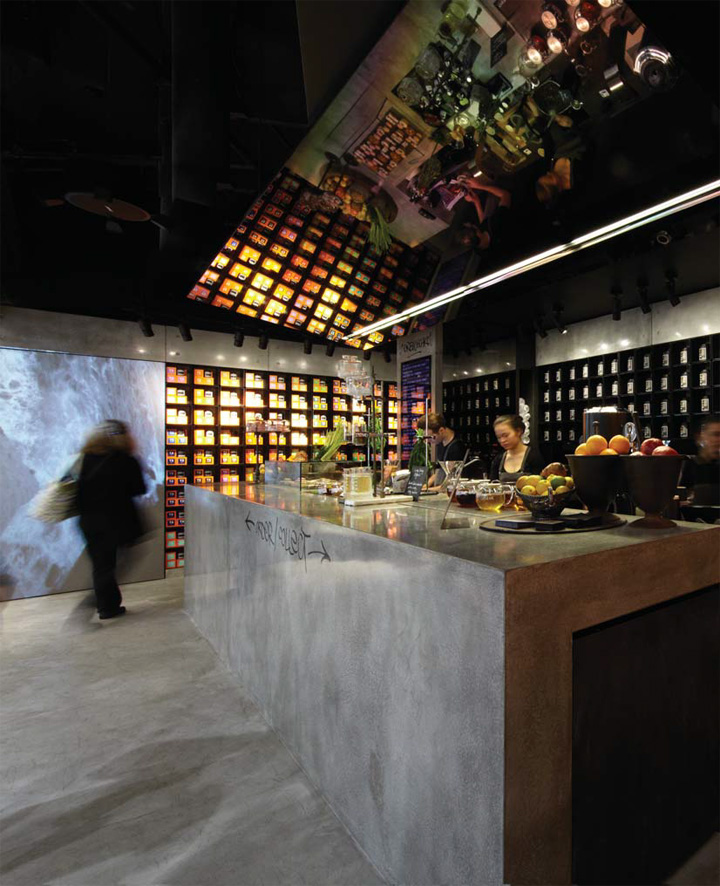 悉尼一间自酿茶的创意体验店 这家商店是一个创意体验店,店内销售的产品是自酿茶,这里的结构运用了大型铸件材料的混凝土钢筋,展示茶的制作工艺与成品。 为了创造更多的戏剧,一个倾斜的镜面天花板安装在吧台上端,整个效果使得空间视觉效果更加丰富饱满。由黑色的氧化钢制作成的 货架是开放式的茶库,这黑暗的调色板使得橙色包装在受到了强烈的照明下能够脱颖而出。