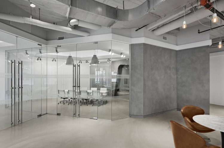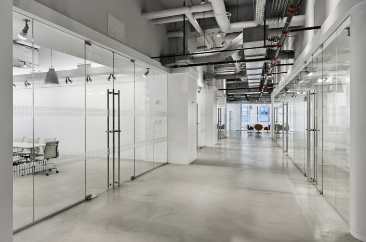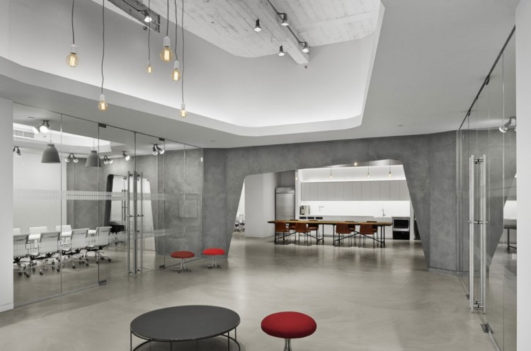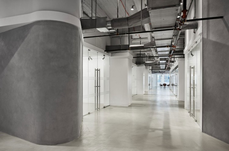 经典的空间设计案例,今日我们与大家分享的这个空间作品是Spacesmith建筑事务所为香港利丰有限公司在美国的分公司打造的办公空间。办公室坐落于纽约帝国大厦第五楼,面积超过了10万平方英尺,层高有17英尺,设计师们模仿了SOHO LOFT的设计风格,以水泥灰和纯白为主调铺陈,并加以暴露的钢筋与管件,还有不加雕琢的承重柱,来营造出硬朗冷峻的工业气息。虽然整个室内极少用到鲜亮色彩,但大量灯饰、窗户和落地玻璃的运用为空间带来了充足的光线与通透感,再配上不规则的特殊墙面切割,巧妙点出设计师强调的原始装饰风格与设计感。