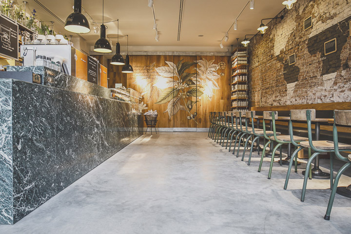 这间店坐落于阿姆斯特丹,实体店使用了古典风格,青色大理石、老式灯具、椅子和木材、老式玻璃瓶,结合混凝土和白色瓷砖,风格扭曲与设计上的协调的过渡,既能够体验了本土特色也能够享受着舒适的环境。