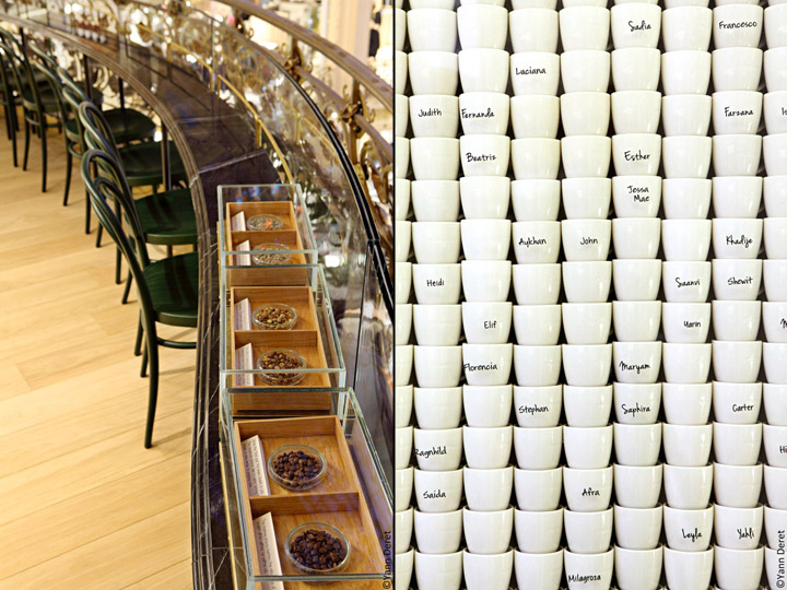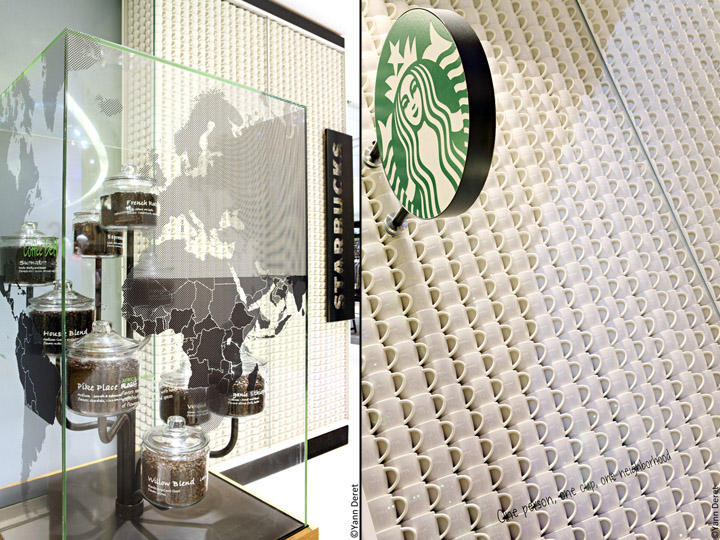 巴黎,一定要对应的是华丽与时尚,这是建在奥斯曼大街老佛爷百货公司三楼阳台的一道风景线。制作采用当地木材和黑色的大理石,黄铜,玻璃和金属,店内的设计灵感来自时尚界,这间店具有标志性的特色就是使用咖啡杯作为建筑材料,体现品牌使命:“一人一杯”7,400咖啡杯层层叠盖壁的一部分,创造一个抽象浮雕的混合效果。