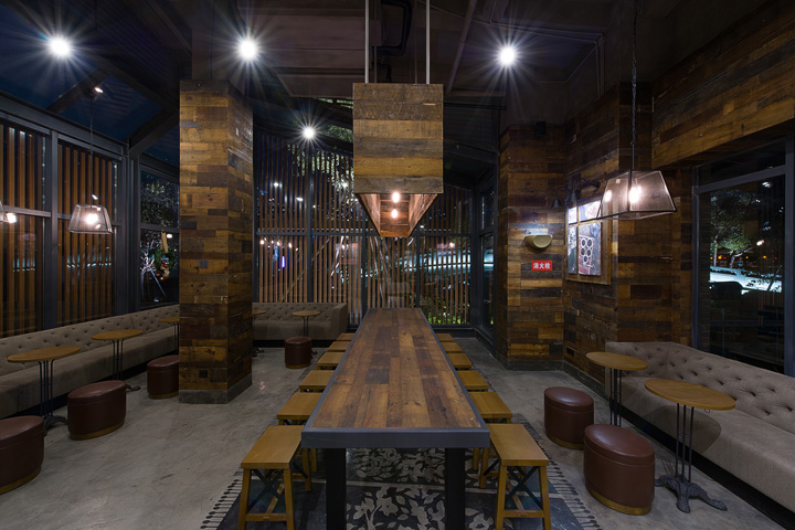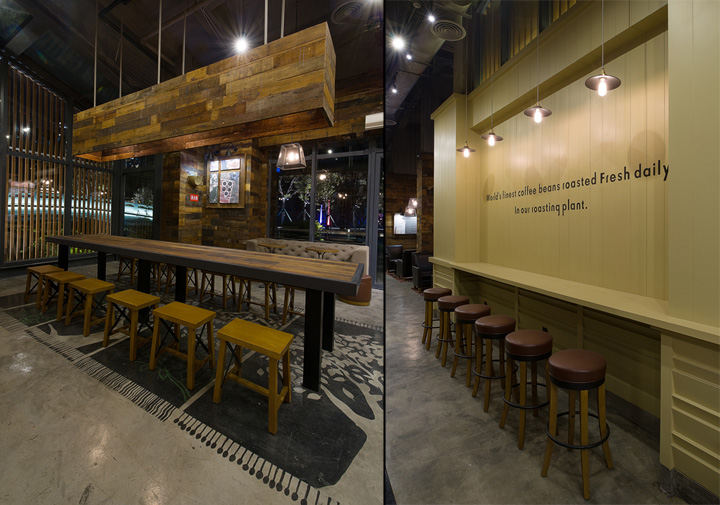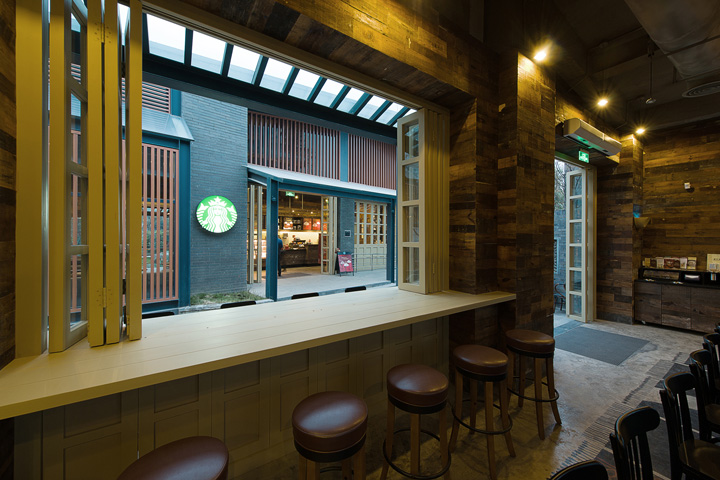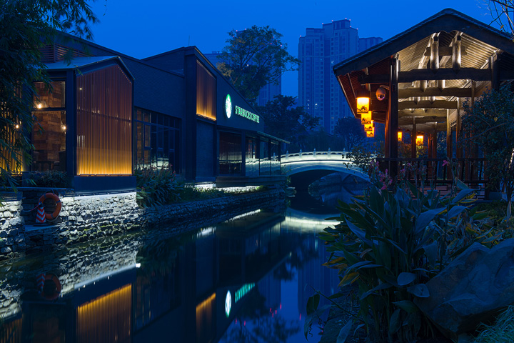 成都,星巴克成都天府滨河店向人们展示了星巴克的精神,分享咖啡的激情。设计理念利用了空间优势,设计师用真诚朴实的颜色和再生木板表达着设计激情。这家店是由两个独立式建筑物与一个风景优美的河景组成。他们最大限度采用了自然光线,并建立了通过最大化的窗口区域。当地相关的文化元素通过MERCH显示,手绘画则由本土的绘画团队完成。回收的木板,木梁和混凝土地板的引入是真正的可持续材料,这间店的成功在于其工艺和优质材料。