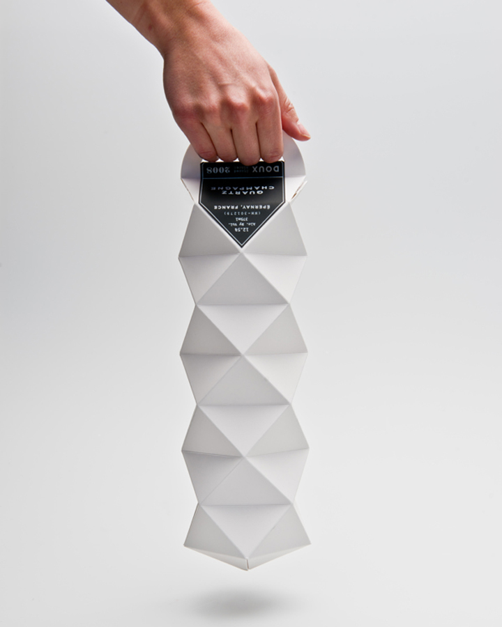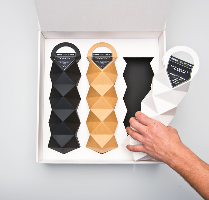 香槟包装设计,几何结构处理具有一定的抗震性,整体设计风格简洁而高档,领带的造型彬彬有礼,是一款包装异形设计的成功案例。
