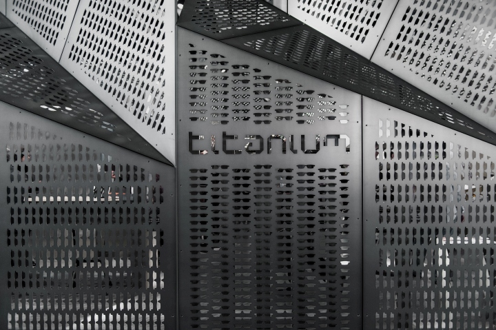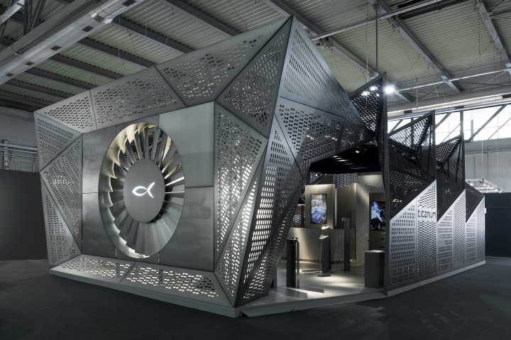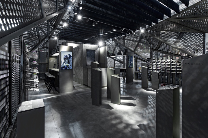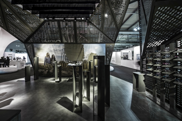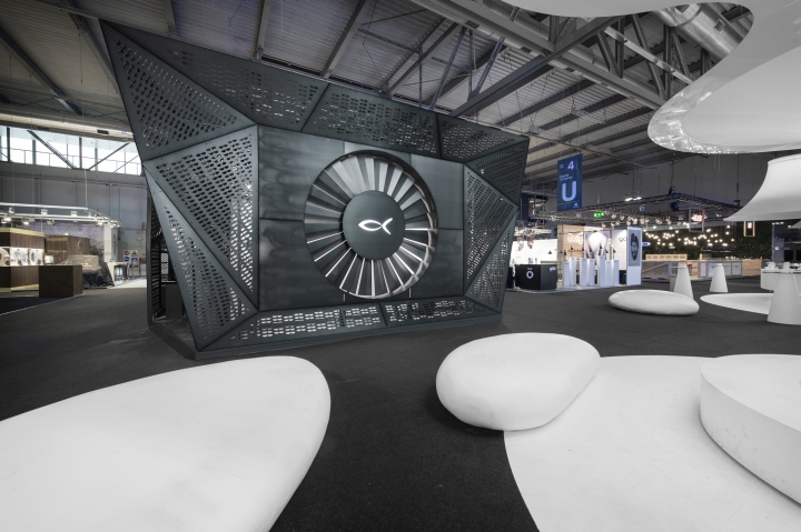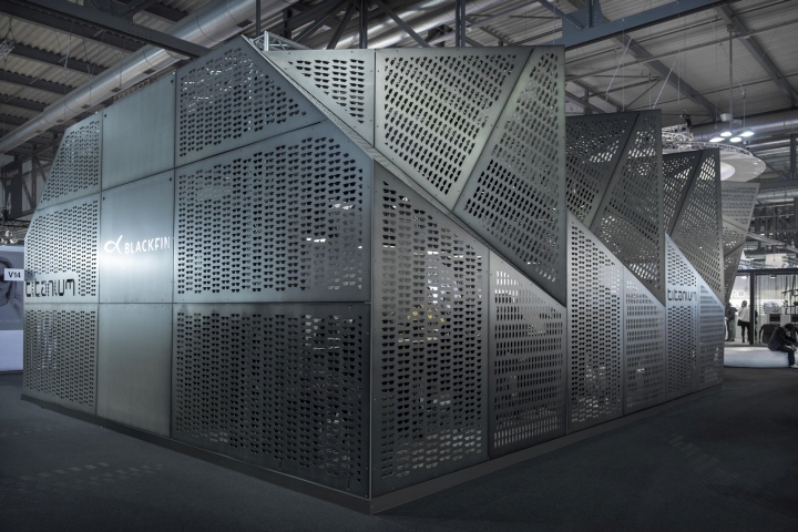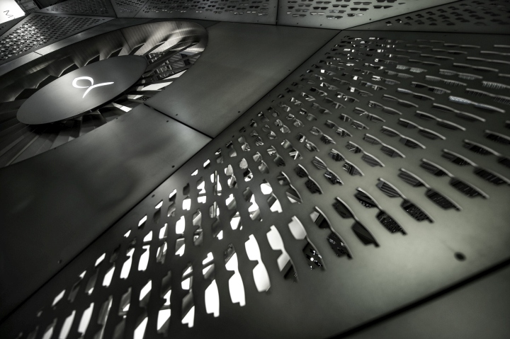 意大利品牌Blackfin Titanium Eyewear, 创办于2007年,一直以来提供着高品质的眼镜,其基本设计是由简单的线条和圆弧框架的特点来定义造型。这些眼镜使用的是高品质的日本钛,熟练的工艺成形 归功于44年的加工经验,是一中非常年轻的设计理念。展厅的设计是由占据中心舞台一个强大的“机器”涡轮造型,设计师认为这能够代表其发展过程中所进行的 Blackfin处理器的旅程。其强大视觉冲击力震撼着整个展厅,强大的品牌基因决定了其品牌个性,张杨,炫酷,不拘一格。