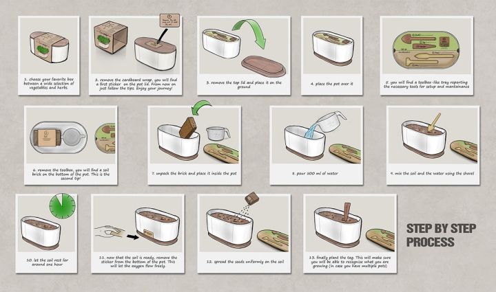 包装设计-阳台上的菜园 到2050年,全球共计60亿人口将居住在城市地区。设计商希望通过在阳台上轻松的种植蔬菜作为一个有趣的创意点,以一种引人入胜的体验来教育人们重新连接人与自然的城市环境。该设计包包括一个锅,土,肥料,园艺工具,种子和喷壶。以其现代化的和最小化的结构,被用于在阳台或室内都是非常不错的选择。 品牌设计,VI设计,VI设计公司,心铭舍 www.xinming.sg